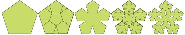 Se genera a partir de un pentágono regular generando 6 pentágonos y 5 triángulos isósceles que se eliminan. Se itera el proceso con los pentágonos que se generan en la etapa anterior.