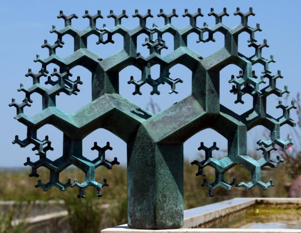 Escultura en bronce Árbol fractal ingleteado II (2000), diseñada en la década de 1980 y realizada inicialmente en madera por el artista y matemático neerlandés Koos Verhoeff. Imagen tomada de Mathematical Arts Gallery