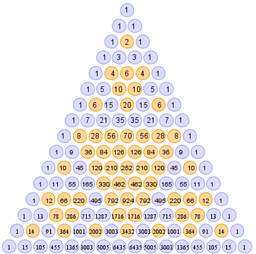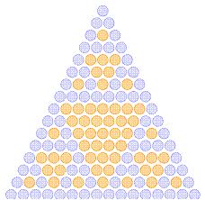 Ahora, superponiendo un triángulo de Sierpinski sobre el de Pascal (siendo los dos de igual tamaño) se puede comprobar que los triángulos coloreados de azul se corresponden con los números impares y los naranjas con los pares.