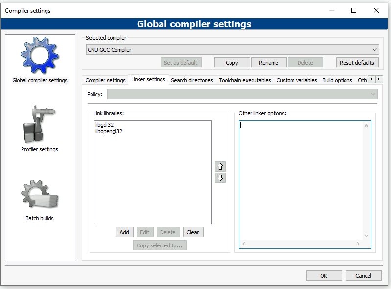 En la pestaña “Linker settings” con el botón Add añades sucesivamente: libgdi32 y libopengl32